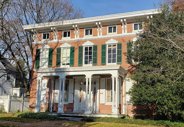 Cyrus Polk House at 303 High Street was built around 1853 in Greek Revival/Italianate style. Polk was a prosperous wheat merchant. Notice the beautiful brackets under the roof and the elaborate lintels over the second floor windows (which are made of cast iron). UPDATE 5/10/2021: This lovely house, also known as the Miller House after more recent owners, was gutted by fire on May 8, 2021.